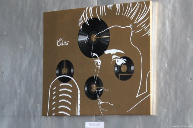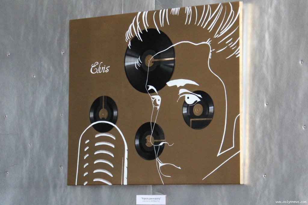 Одна із картин, представлених на виставці, - «Король рок-н-роллу». «Картина зроблена із справжніх пластин. Цей стиль називається поп-арт. На ній зображено обличчя Елвіса Преслі», - коментує власне творіння Дмитро.