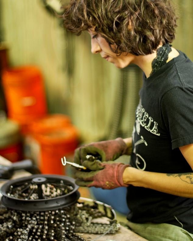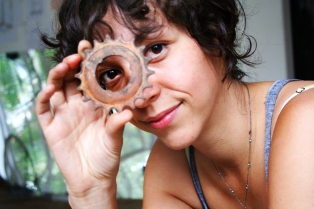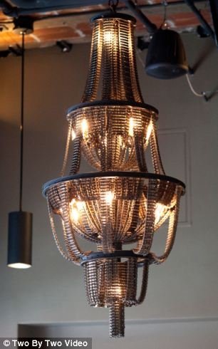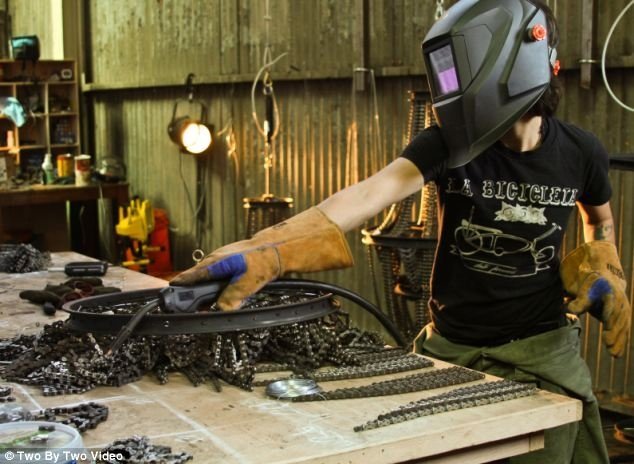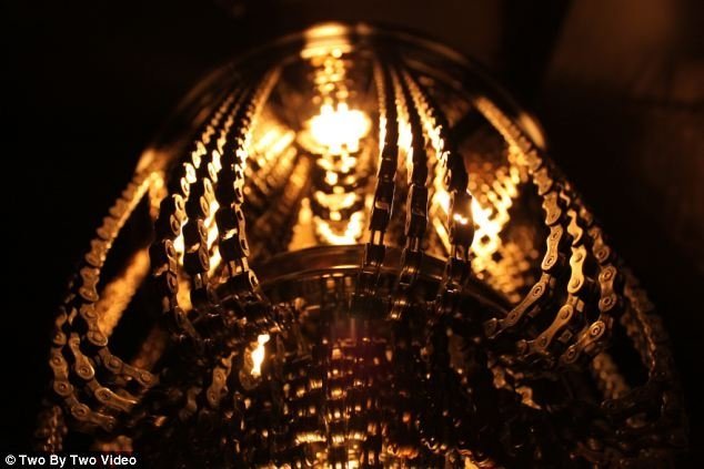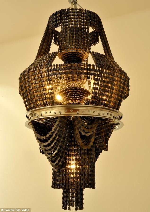 Так, використовуючи велосипедні ланцюги, колеса та інші деталі велосипеду, вона зробила люстру.