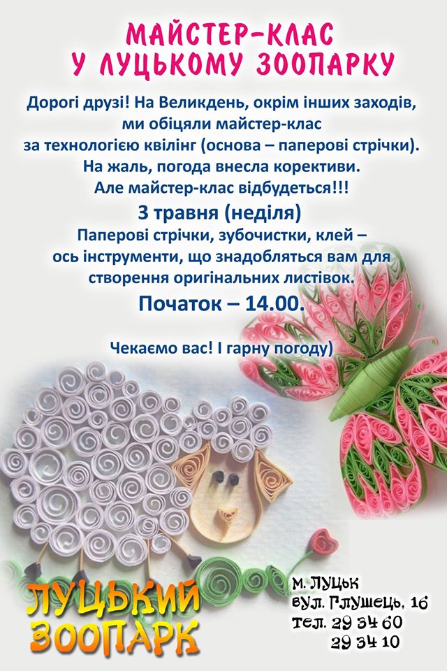 Лучан запрошують на майстер-клас за технологією квілінг, який відбудеться завтра, 3 травня. Про це йдеться на сторінці Луцького зоопарку у мережі Фейсбук.