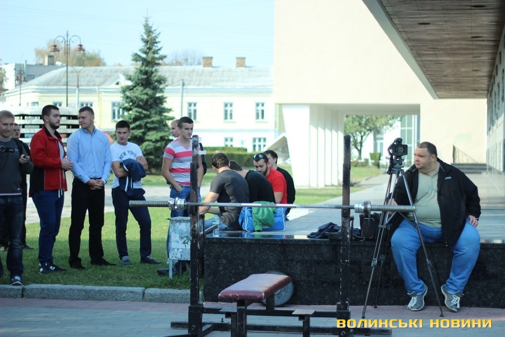 Штангу та відповідне приладдя встановили просто в центрі міста, а до участі запрошували всіх охочих. Для того, щоб помірятись силою було достатньо заплатити 30 гривень за участь – ці кошти, а також добровільні пожертви від глядачів, організатори дійства передадуть на потреби батальйону територіальної оборони «Азов», який воює за цілісність України на Сході.