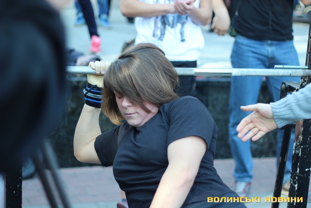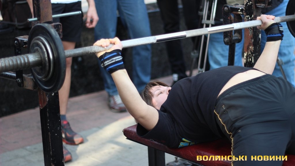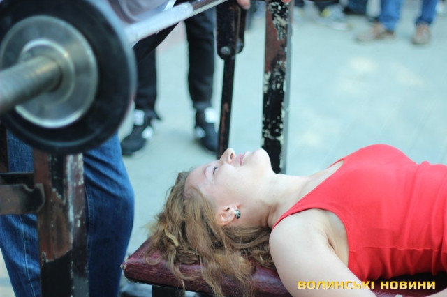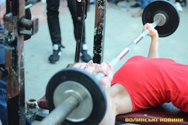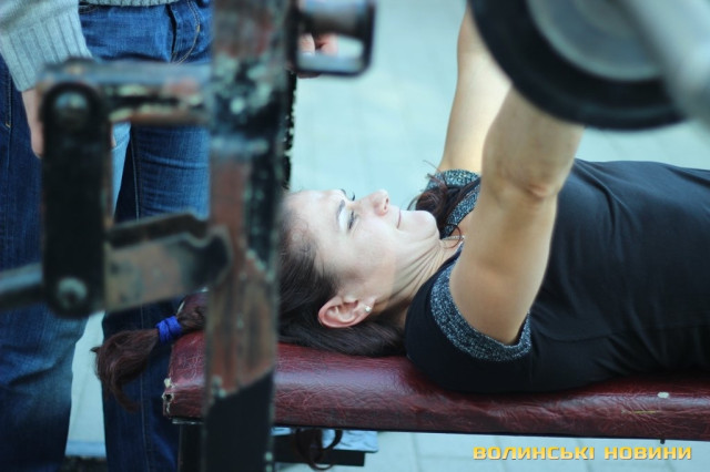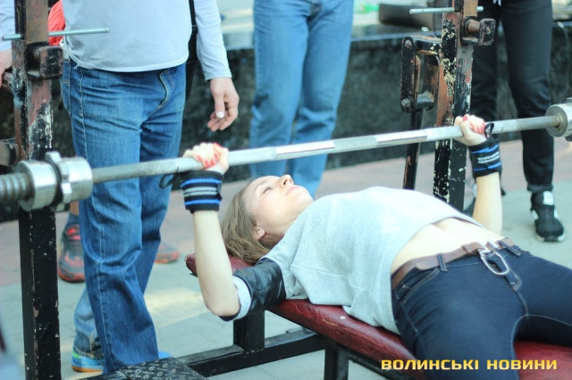 До слова, серед охочих помірятись силою та при цьому допомогти воякам,виявилось чимало дівчат. Так, змагання відкрила лучанка Ольга.Тендінта дівчина попри свою вагу 46 кілограмів спромоглась показати достойний результат, віджимаючи штангу 24 рази.Проте, наступна учасниця пані Ірина спромоглась серйозно покращити цей результат – дівчина підняла 34-кілограмову штангу аж 80 разів.Однак цей рекорд не втримався до кінця змагань.