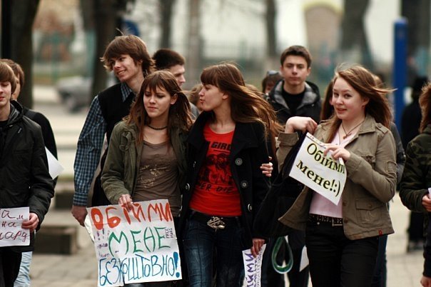 Близько 50 молодих людей із плакатами «обійми мене», «безкоштовні обійми», «Free Hugs» пройшли центральними площами Луцька і обнімалися з перехожими.