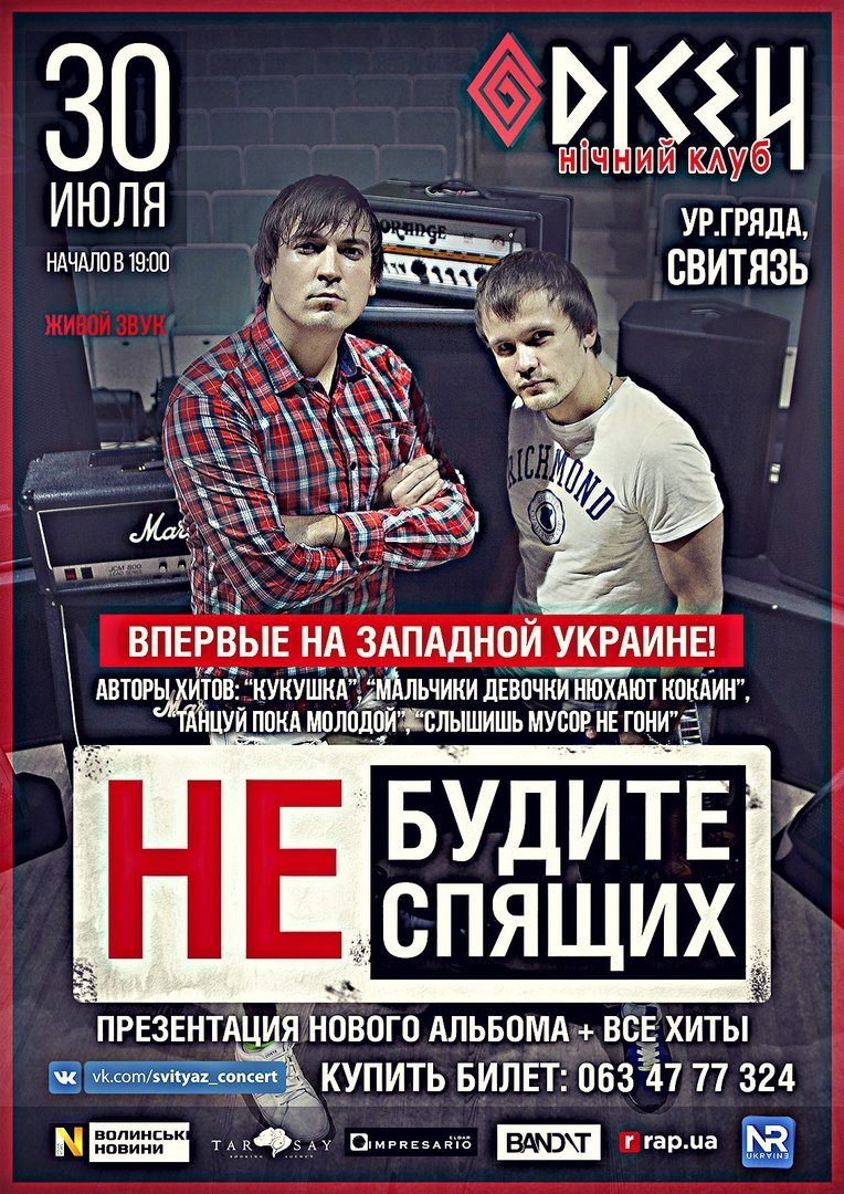 Білоруський гурт «Не Будите Спящих» дасть на Світязі концерт. Виступлять хлопці у суботу, 30 липня, у клубі «Одісей», що в урочищі «Гряда», – повідомляють організатори.