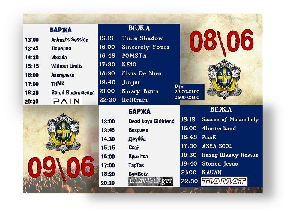 Глядачі матимуть змогу побачити шведські та українські рок-гурти «Pain», «Helltrain», «Clawfinger», «Tiamat», «Воплі Відоплясова», «Бумбокс», «ТНМК», «Тартак», «С.К.А.Й.», «Крихітка», «Кому вниз» та багато інших.