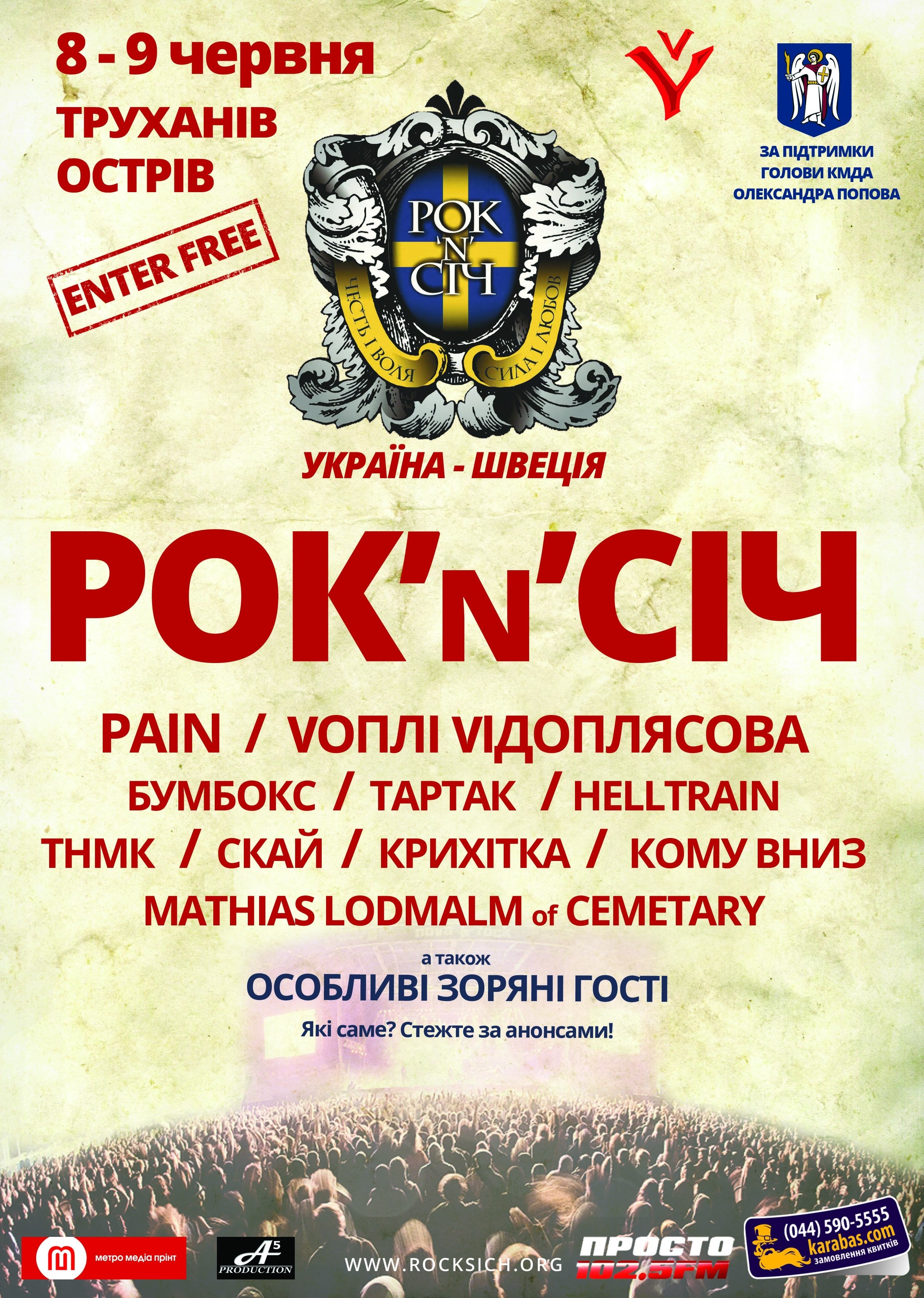 Масштабний україно-шведський фестиваль «Рок’N’Січ» із вільним входом для всіх шанувальників якісної музики відбудеться на Трухановому острові у Києві 8 та 9 червня цього року.