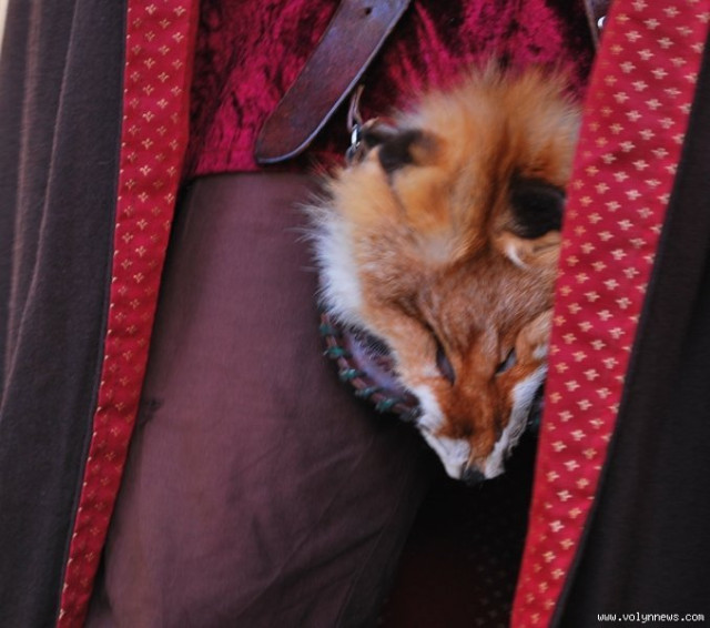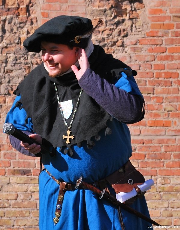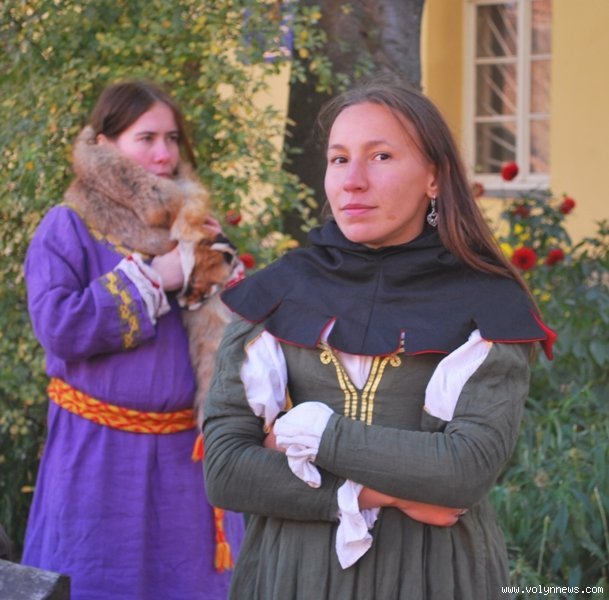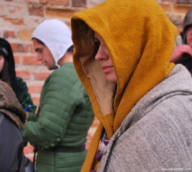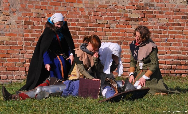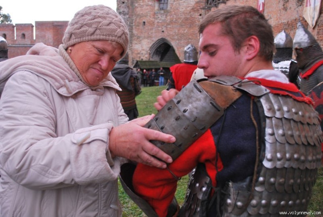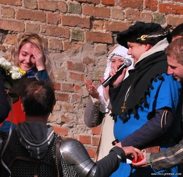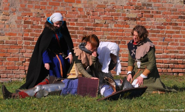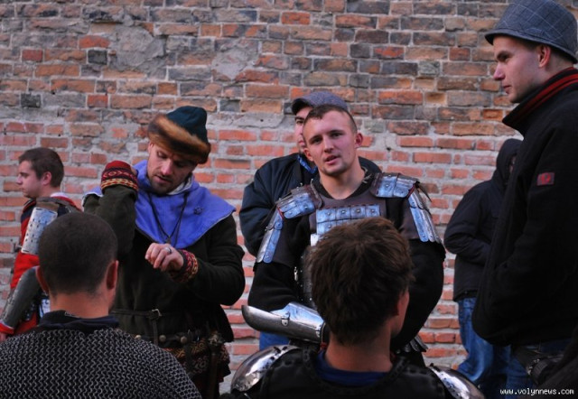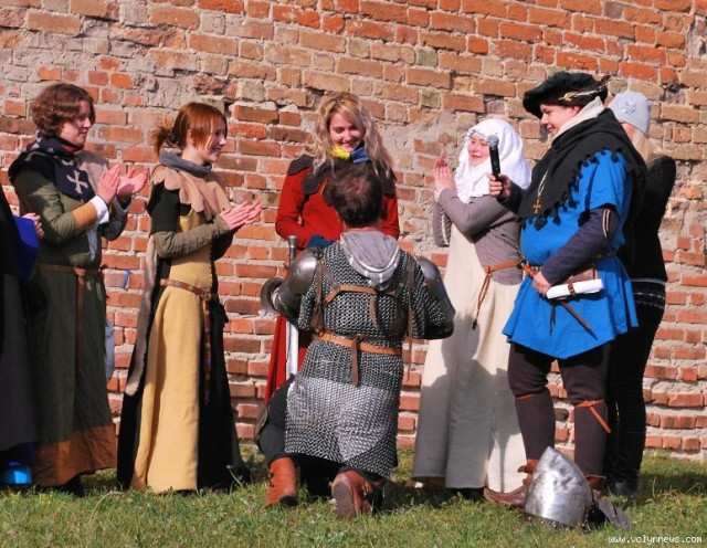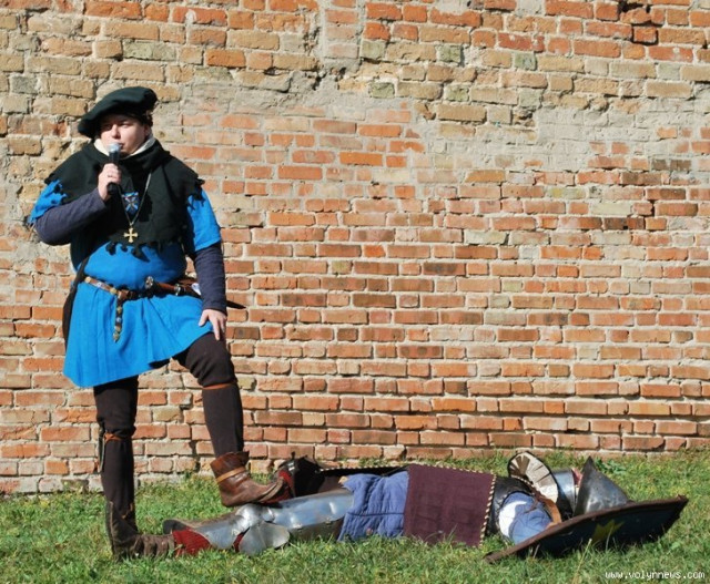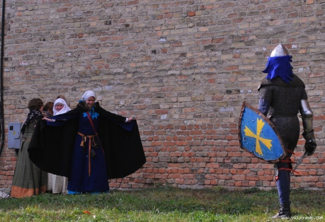 Отож, з юрби придворні дами з клубів історичної реконструкції вибрали гарну дівчину, яку вбрали у середньовічні шати. Юнка, згідно з запропонованою легендою, була дочкою ведучого, який грав роль короля. Одначе, темний лицар викрав дочку, лати лицаря, котрий мав захищати принцесу.