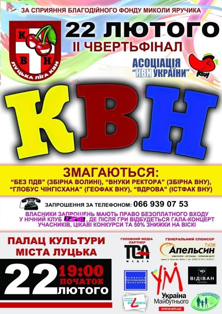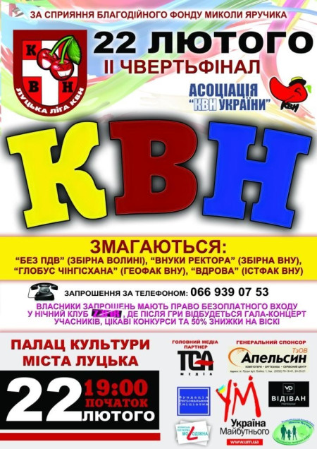 У Луцьку 22 лютого відбудеться друга чвертьфінальна гра Луцької ліги Асоціації КВН України.