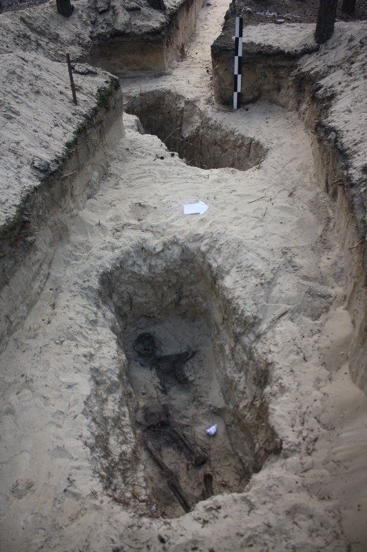 У східній частині траншеї довжиною 34 метрів зафіксували дві плями від заповнень похоронних ям. При їх розчищанні виявили два поодинокі захоронення, зорієнтовані головою на південний захід. Захоронення №1 здійснили у труні, скелет не мав видимих прижиттєвих травм. Проте, на скелеті захоронення № 2 виявили чіткі сліди численних переломів кісток і черепа.