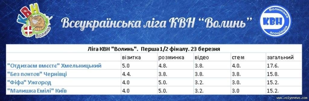 Таким чином, з цілковитим відривом майже у 2 бали перемогу у першому півфіналі п’ятого сезону Ліги КВН «Волинь» здобули хмельничани з «Отдихаєм вмєстє».