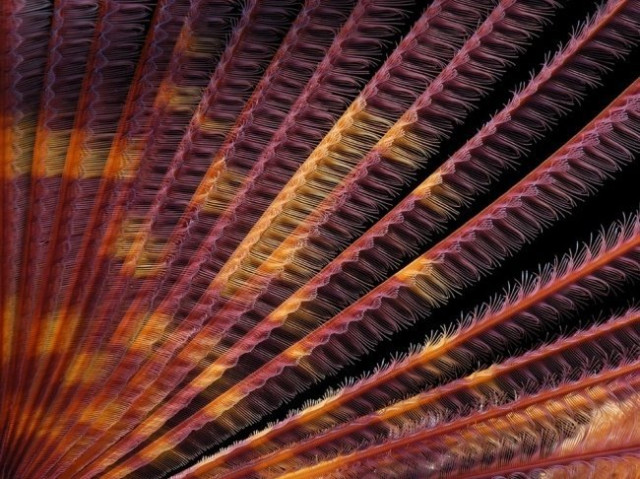 При великому збільшенні на знімку видно мережу тонких волосків хробака-сабелліда. Волоски поділяють водну суспензію на кілька потоків, які приносять частки - в тому числі мінеральні речовини і детрит для захисного «будиночка» - прямо в рот тварини. Яскраві кольори попереджають хижаків про те, що черв'як може бути отруйним. Дарлін А. Муравський