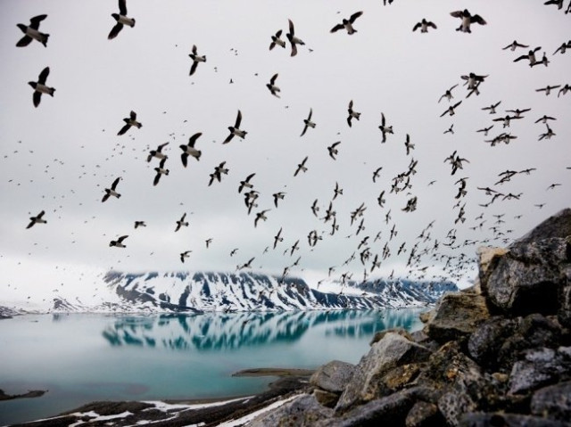 Екосистема Шпіцбергена - небо, море та узбережжя. Малі гагарки гніздяться на уступах скель і пірнають за веслоногими раками. Розклалися останки птахів і їх послід служить добривом для заростей мохів, в яких влаштовують засідку песці. Пол Ніклен