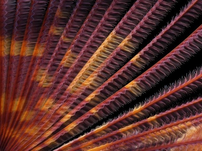 При великому збільшенні на знімку видно мережу тонких волосків хробака-сабелліда. Волоски поділяють водну суспензію на кілька потоків, які приносять частки - в тому числі мінеральні речовини і детрит для захисного «будиночка» - прямо в рот тварини. Яскраві кольори попереджають хижаків про те, що черв'як може бути отруйним. Дарлін А. Муравський