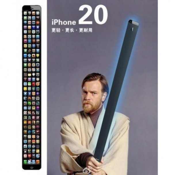 Поява iPhone 5 збурила уяву користувачів соцмереж, які почали створювати на цю тему фотожаби. Найбльшим розчарування відданих айфономанів стало те, що довгоочікувана модель смартфону майже нічого не отримала нового, але збільшилася у розмірах (новий айфон отримав діагональ екрану 4 дюйми – ред.). Саме з цього користувачі і знущалися, порівнюючи нову модель із тим, що вийдуть у майбутньому. Відтак, на думку інтернет-юзерів, iPhone 20 у довжину нагадуватиме лазерний меч джедая.