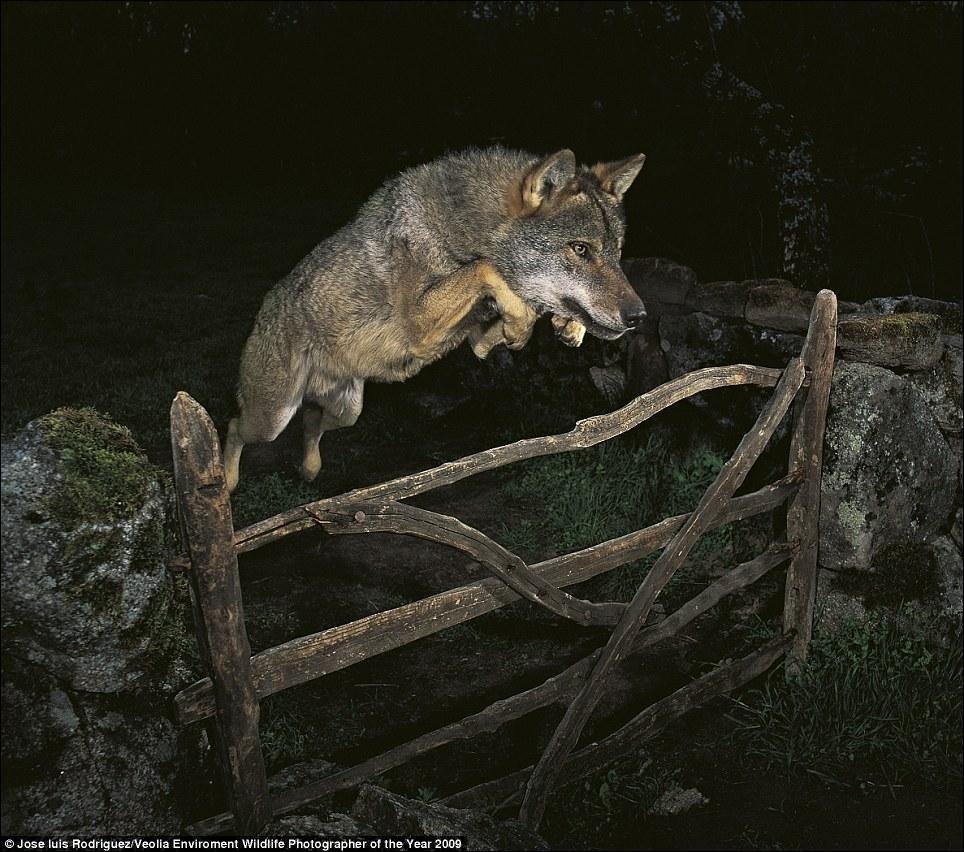 1. Конкурс виграв знімок іберійського вовка. Тварина на фотографії схожа на коня, який стрибає через дерев’яний паркан.