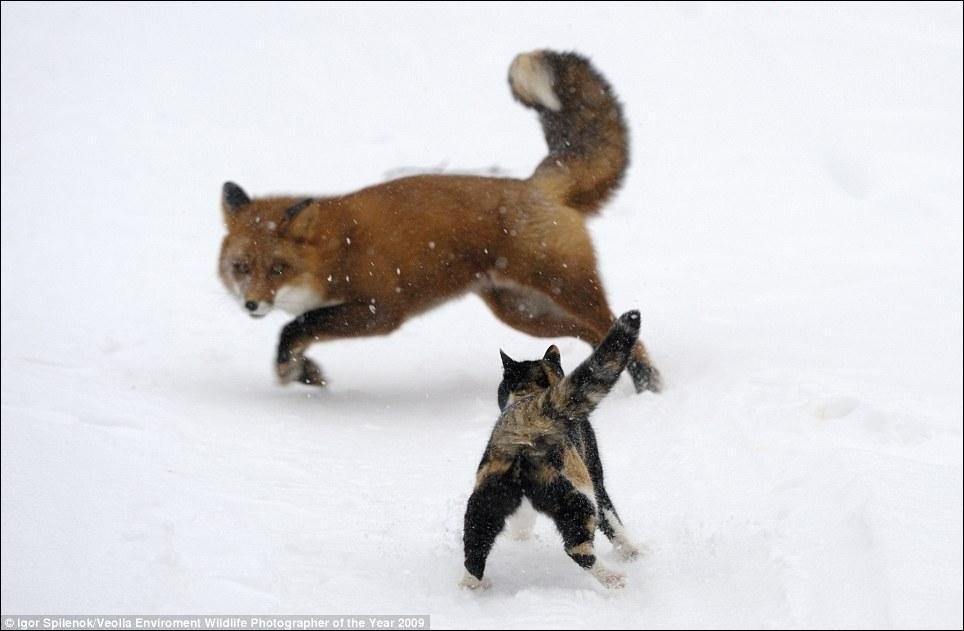 3. Російський фотограф Ігор Спіленок спіймав у кадр хороброго кота, який охороняє свою територію від лисиці, втричі більшої від нього.