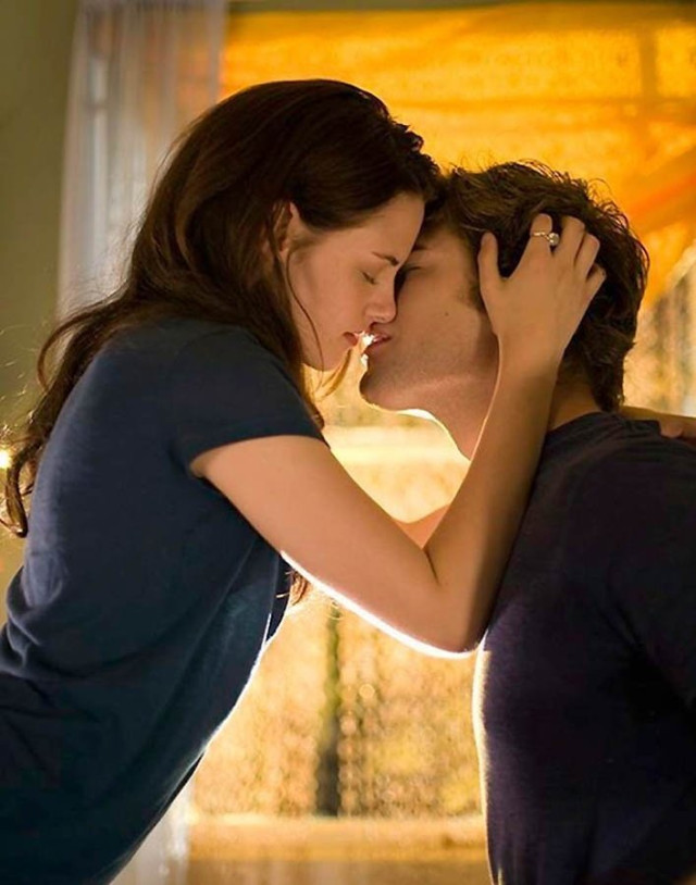 Крістен Стюарт і Роберт Паттінсон цілуються у фільмі «Сутінки» в 2006 році. Вампірові Едварду нелегко цілувати кохану, так як його інстинкти можуть призвести до того, що він просто вип'є все її кров.