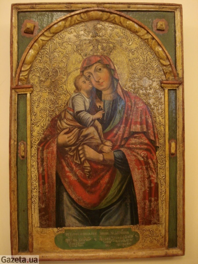 "Подивіться, Богородиця чорними фарбами намальована, наче афроамериканка. Ці галичани що хоч понамальовують", - роздивляється ікону жінка з яскравим шарфом у квіточку.