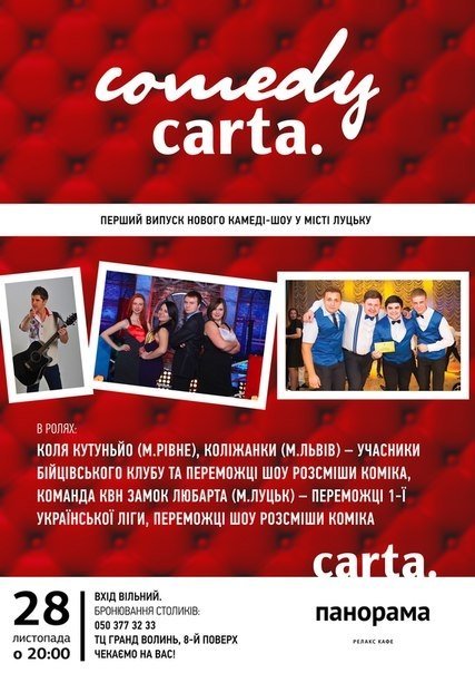 28 листопада о 20:00 – перший випуск нового камеді-шоу у Луцьку! Для лучан виступатимуть переможці шоу «Розсміши коміка», учасники Бійцівського клубу та переможці Першої української ліги КВН!