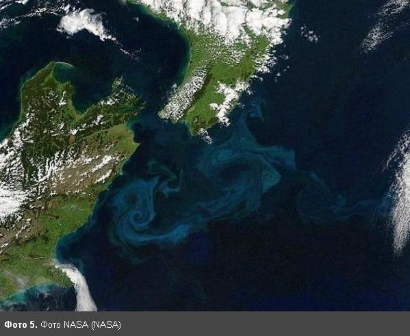 Інші фотографії показують також такі природні явища, як, зокрема, зіткнення холодного і гарячого потоків води біля узбережжя Нової Зеландії. Цей знімок був зроблений 25 жовтня 2009 року з одного із супутників NASA.