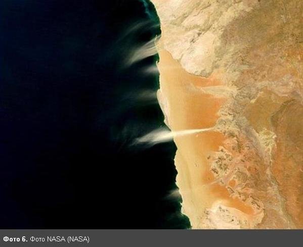 Ще на одній фотографії відображений ураган Катріна, який обрушився на східне узбережжя США у 2005 році. На іншому знімку можна побачити, як стовпи піску забирає в океан з узбережжя Намібії.