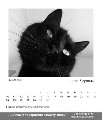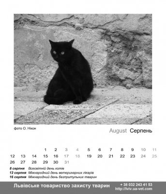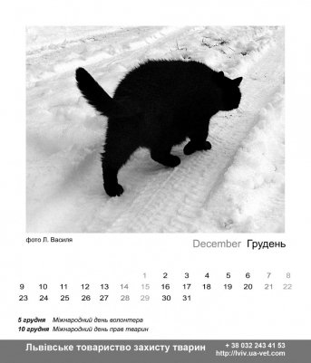 «Під опікою волонтерів нашого товариства зараз - понад 50 котів, відсотків десять з них - чорні. Тому ми вирішили використати презентацію календаря для того, щоб прорекламувати чорних котів, які шукають добрі руки. Але буває, що чорних котиків ображають. Напередодні Хелловіну дзвонили якісь хлопці, просили зовсім чорного кота для ритуалу. Є і казкові зовсім історії. Персидська кішка, яку господарі викинули у під'їзд, переселиася аж у Київ, в маєток чиновника. Зараз нам треба прилаштувати аж тринадцять чорних китів. Серед яких – одноокий Кутузов, Чорнуся та Фрузя. Котики стерилізовані та дуже потребують господарів» , - додає Ольга Сидор.