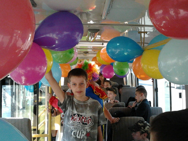 Із вікон автобуса звучала гучна музика, що привертала увагу перехожих лучан. Салон був заповнений кольоровими кульками, а веселий клоун зустрічав дітей з цікавими конкурсами, подарунками і танцями.