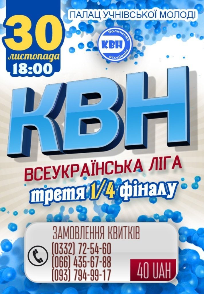 Останній, третій, чвертьфінал шостого сезону Всеукраїнської ліги КВН «Волинь» відбудеться 30 листопада, о 18:00 у Палаці учнівської молоді, - повідомили у керівництві Ліги.