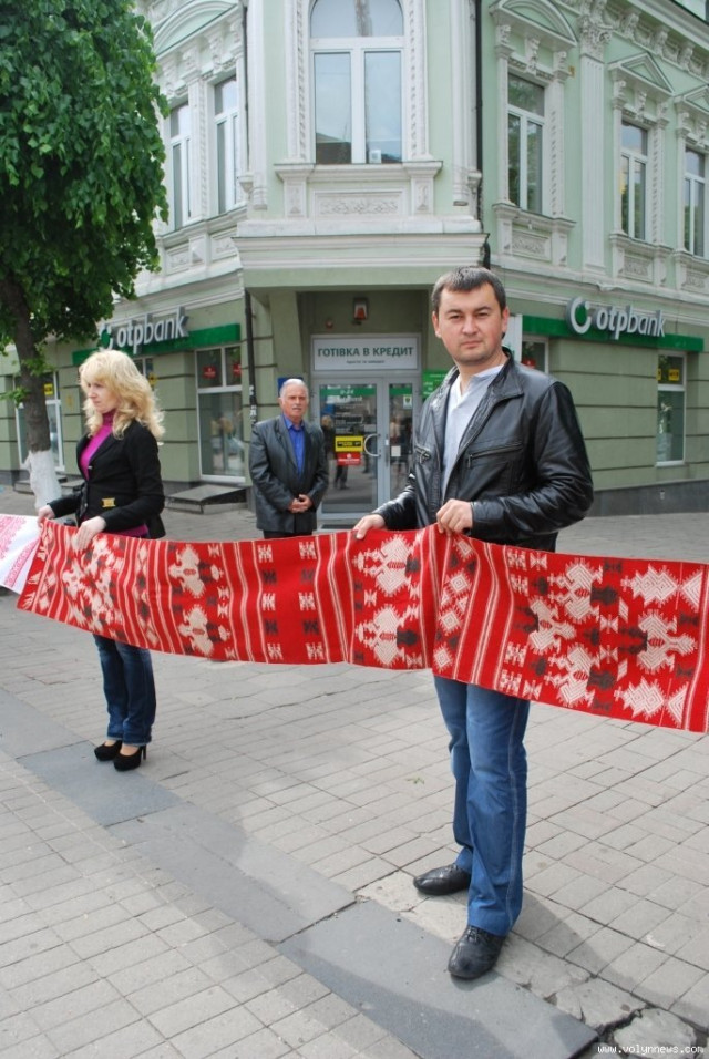 Його колега з міста Славута Василь Сидор також привітав жінок із Днем матері, а також зауважив, що українці мають пам’ятати й шанувати історію рідного народу. «Тому ми приєдналися до цієї акції, приїхали з рушниками. Ми також хочемо презентувати прапор, який вишивали своїми руками всі славутчани, для того, щоб сказати, що традиції продовжуються, що Україна багата на історію, мистецтво, яке буде мати продовження в наших дітях і онуках» - наголосив Василь Сидор.