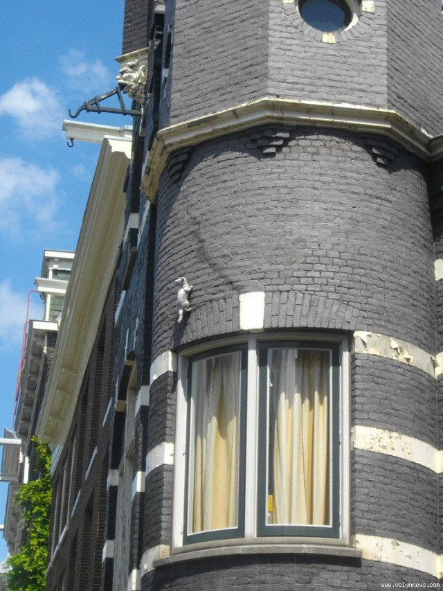 Особливість кожного історичного будинку розташованого вздовж каналів - балка та закріплений на ній гак для піднімання вантажів. Він відіграє не декоративну, а цілком практичну функцію: амстердамці досі за його допомогою піднімають меблі на верхні поверхи (гвинтові сходи усередині надто вузькі для цього). Для зручності фасади будинків трішки нахилені вперед.