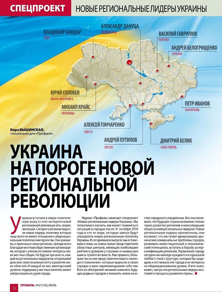 Спецпроект «Новые региональные лидеры Украины» журналу «Профіль» має на мені вивчити, як може змінитися ,ситуація в містах після 31 жовтня 2010 року і хто ті люди, які завтра будуть визначати нову регіональну політику України – пише «Профіль».