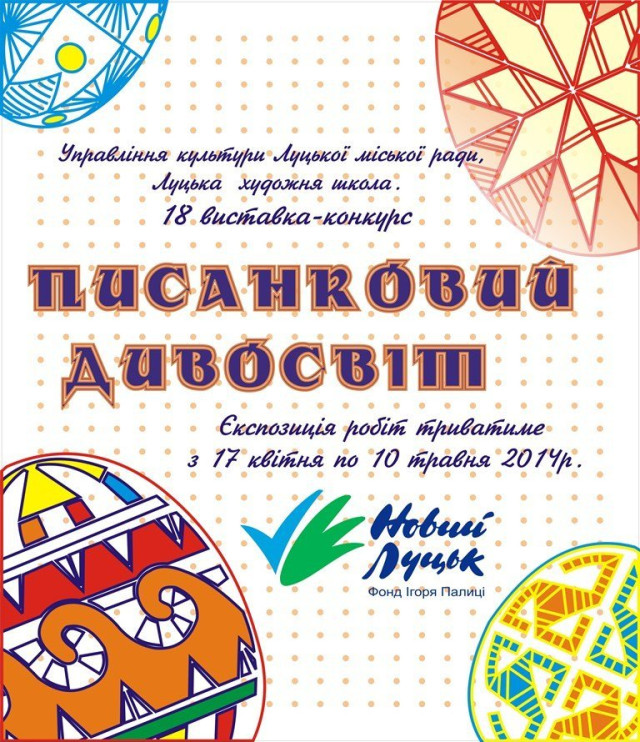 Виставка «Писанковий дивосвіт» розпочне свою роботу 17 квітня о 15.00 годині в приміщенні арт-галереї у Луцьку (вул. Богдана Хмельницького, 1). До участі в конкурсі організатори – Управління культури ЛМР та Луцька художня школа – запрошували молодь віком від 8 до 18 років, які подавали до розгляду авторські роботи (не менше 4-ох писанок одного автора, виконаних у традиційній манері).