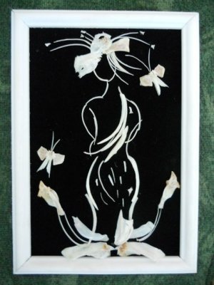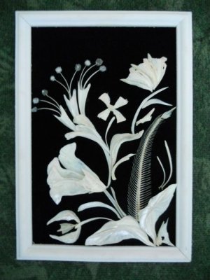 Візерунок із рибʼячих кісток Василь Рябоконь викладає на чорному оксамиті, прикріплює клеєм, зверху покриває лаком. Ефект досягається контрастом чорного та білого кольорів.