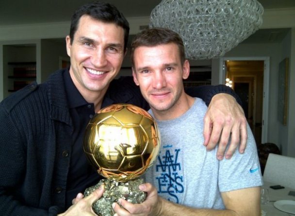 Володимир Кличко на деякий час став володарем «Золотого м'яча», якого йому вручив Андрій Шевченко.