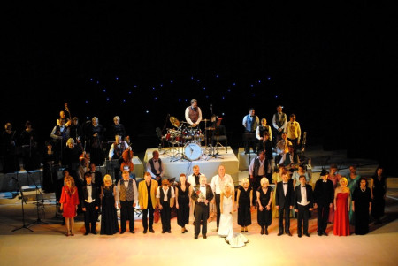 Музиканти оркестру грали на фоні імпровізованого зоряного неба. Якісний звук відзначили і самі глядачі. Найбільше гостям свята запам’ятався музичний номер під час якого, нібито п’яний артист вийшов до зали і просив гроші у присутніх. Звісно ж це була постановка, але всім дуже сподобалося.Двогодинний феєричний концерт актори завершили молитвою. Фото Миколи Хоми