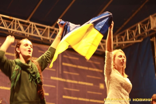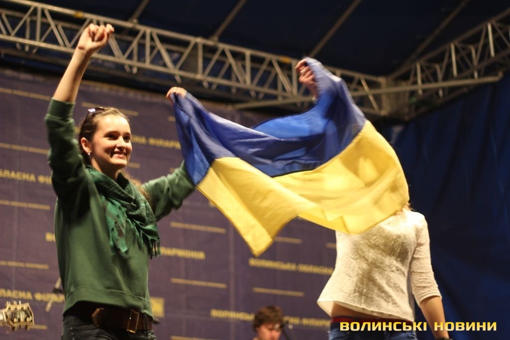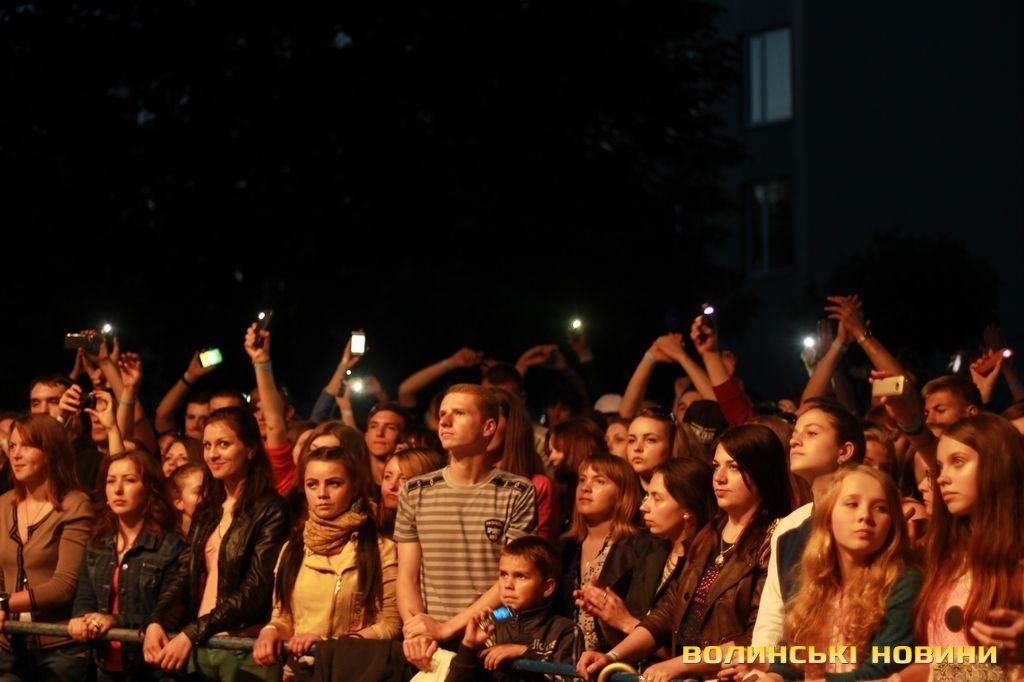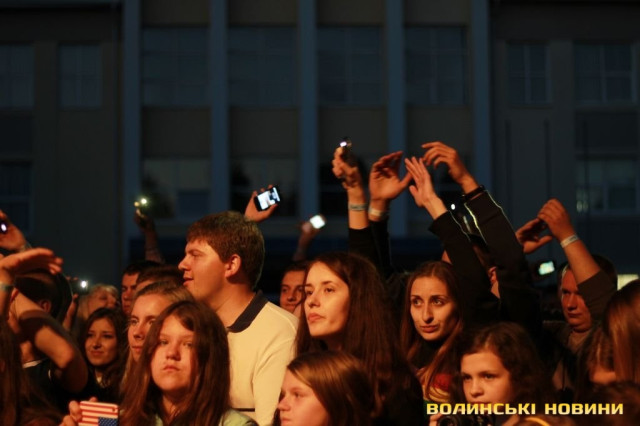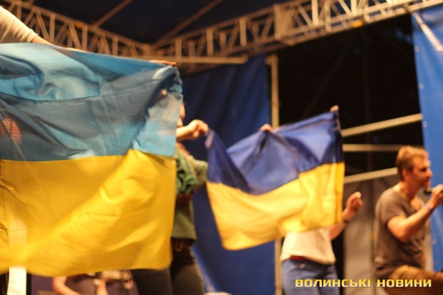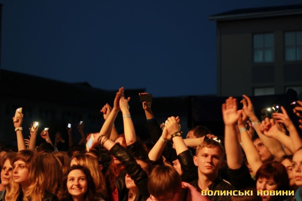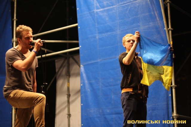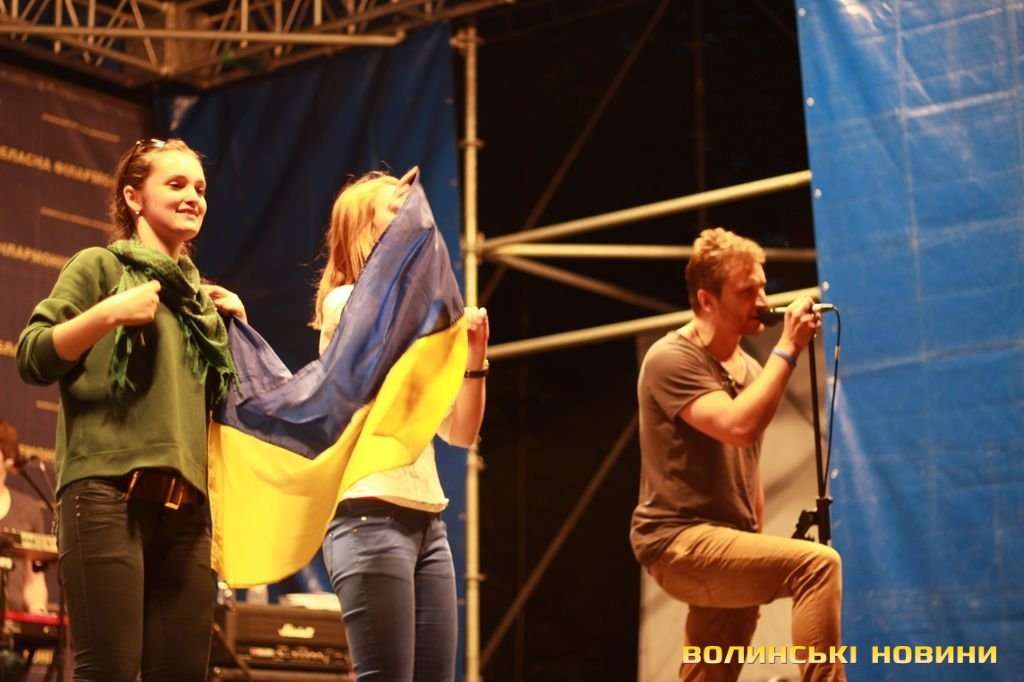 Після чого запросив на сцену лучан, які брали участь в розгортанні стягу. Під прапором України гурт виконав пісню «Ми разом! – Мы вместе!» з нового альбому «Край неба». Нагадаємо, в березні 2014 року кліп на цю композицію гурт записував всією Україною: всі бажаючі повинні були відзняти відео з плакатом «Ми разом! – Мы вместе!» на фоні назви міста або пізнаваної місцевості. Тоді у флешмобі взяли участь сотні людей зі всієї України.