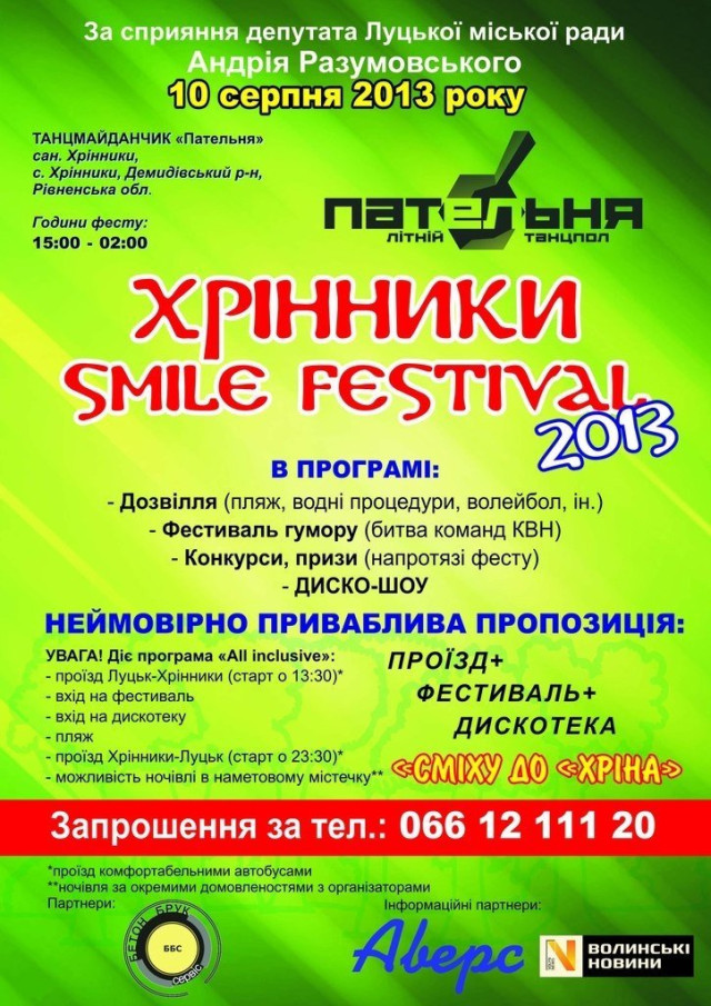 10 серпня, в суботу, очевидно жителі міст «утечуть» зі своїх осель аби зануритися в ауру веселощів та відпочинку. І справді, краще не придумаєш. Згідно з умовами фестивалю діятиме програма «All inclusive», все включено, в якій кожен, хто бажає влаштувати власне дозвілля за містом, на березі популярного для жителів Волинської та Рівненської областей урочища Хрінники, може абсолютно не турбуватися про доїзд та розважальну частину. Варто лише зателефонувати на номер: 066 12 111 20 і зарезервувати місце для себе.