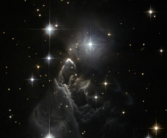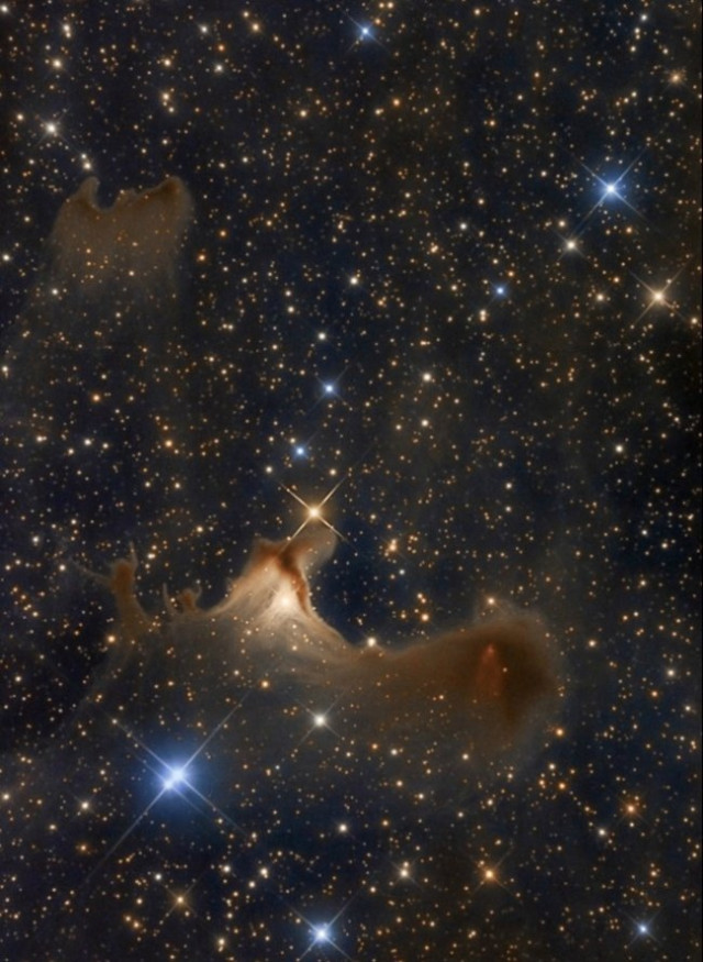 Туманність Sh2-136, де космічні пилові хмари, що слабо світяться відбитим зоряним світлом, ховаються на краю комплексу молекулярних хмар Ореол Цефея, віддаленого від нас на 1200 світлових років.