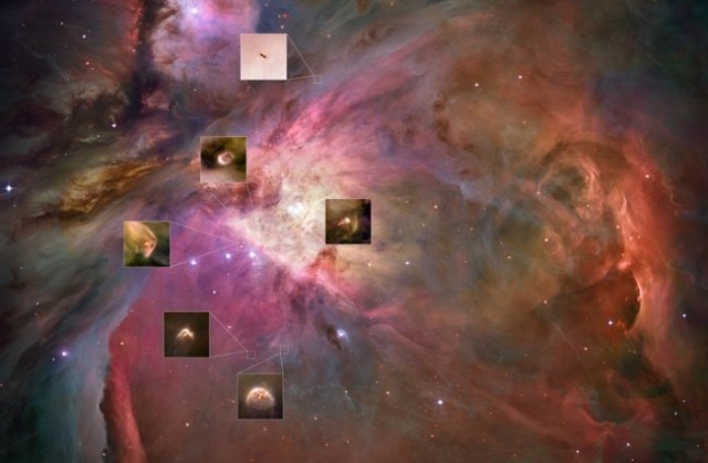 Народження планет. З допомогою телескопа Хаббл вчені спробували з'ясувати, яким чином утворюються нові планети. Так, вони дослідили протягом тривалого часу Велику туманність Оріона, яку можна побачити й неозброєним оком. Вставки на цьому фото показують зоряні ясла, в яких, ймовірно, формуються нові планетні системи.