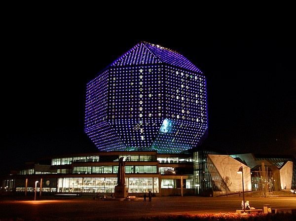 Будівля Національної бібліотеки Білорусі, оздоблена скляними панелями, зовні нагадує гігантську обручку з діамантом. У темну пору доби може здатися, що цей храм знань знаходиться у Лас-Вегасі, адже його підсвічують 4646 світлодіодами, які змінюють колір.