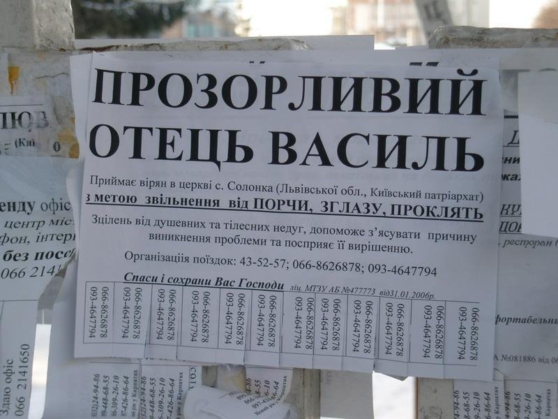 Днями в Луцьку з’явилися оголошення про організацію поїздок до «прозорливого отця Василя», який «приймає вірян в церкві села Солонка (Львівської обл., Київський Патріархат) з метою звільнення від порчи, зглазу, проклять...», - цитує розвішені у Луцьку оголошення прес-служба.