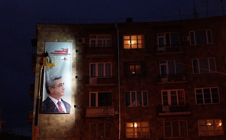 Єреван, Вірменія: робітник знімає передвиборчий плакат сучасного президента Вірменії, Сержа Саргсяна, у зв'язку з «днем тиші» 17 лютого, коли не дозволяється проводити політичну агітаційну кампанію.