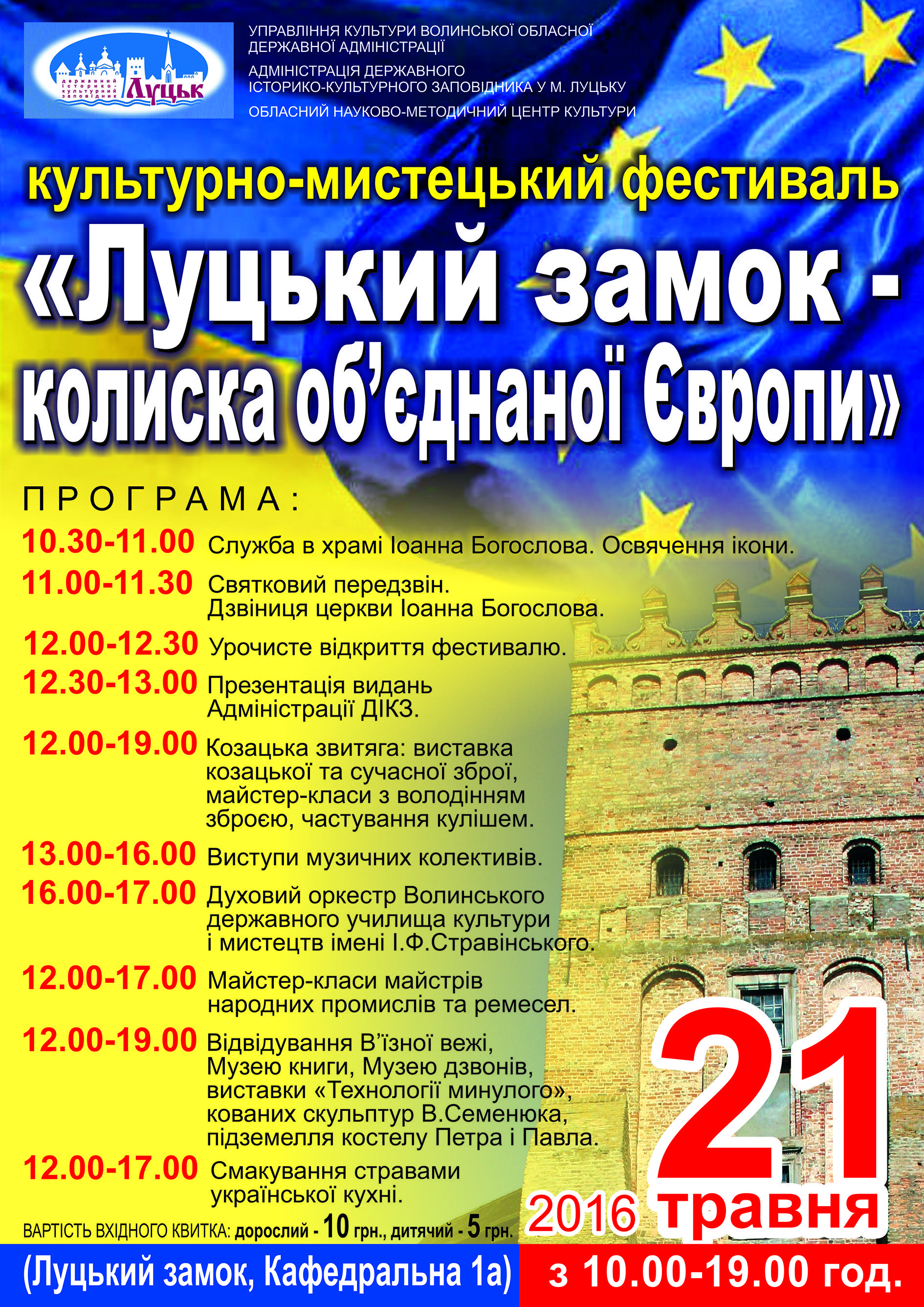 Культурно-мистецький фестиваль «Луцький замок – колиска об’єднаної Європи» в рамках відзначення Днів Європи в Україні відбудеться 21 травня у Луцькому замку.