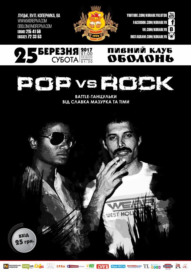 Танцювальну батл-вечірку «ROCK vs POP» організовують у пивному клубі «Оболонь» («Кораблик»). Захід відбудеться у суботу, 25 березня, о 21:30.