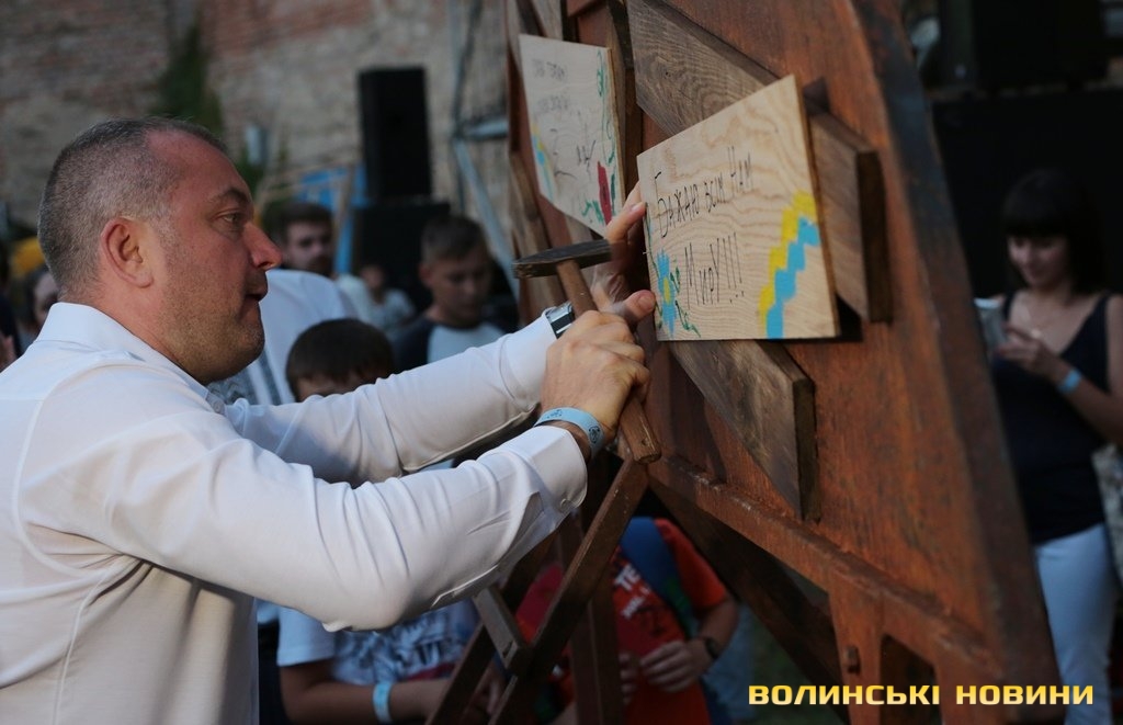 Скульптуру ще не завершили: кожен з присутніх може долучитися до її творення. Придбавши за благодійний внесок дощечку і розмалювавши її, кожен може прибити послання. Усі кошти, виручені за це, спрямують на арт-терапію для бійців АТО.