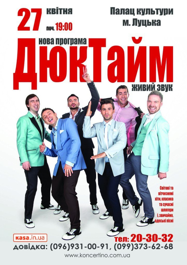 У Луцьку відбудеться концерт одного з найкращих вокальних колективів – DukeTime. Захід запланований на 27 квітня у рамках гастрольного туру колективу.