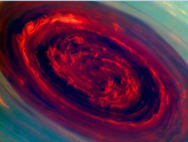 Барвисті знімки зробила американська міжпланетна орбітальна станція Cassini за допомогою спеціальних фільтрів в лютому цього року, але опубліковані вони тільки зараз. Ураган розбушувався на Північному полюсі Сатурна.