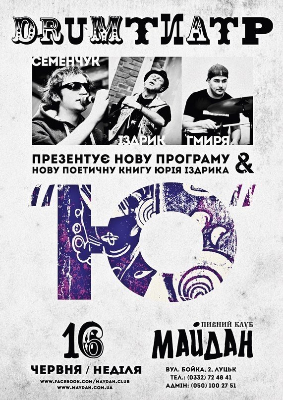 Музична презентація нової поетичної книги Юрія Іздрика «Ю» (видавництво Старого Лева) від гурту DRUMТИАТР відбудеться у Луцьку 16-ого червня.