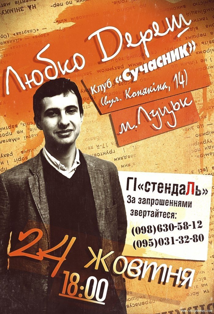 Одного разу лучани вже були обмануті чутками на кшталт «Любко Дереш приїде до Луцька». Але цього разу це - правда! У четвер, 24 жовтня, о 18:00, у клубі «Сучасник» (вулиця Конякіна, 14) ви зможете на власні очі побачити одного з найзагадковіших молодих представників сучукрліту – Любка Дереша!