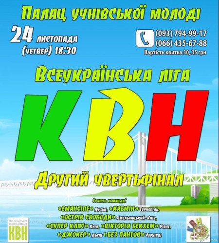 Друга чвертьфінальна гра Всеукраїнської ліги КВН «Волинь» відбудеться 24 листопада о 18:30 в Палаці учнівської молоді Луцька.