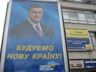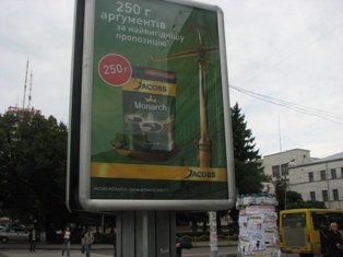 В центрі Луцька розміщений тристоронній рекламоносій - сіті-лайт - на якому розміщена реклама кави, презервативів і зображення Президента України Віктора Януковича.